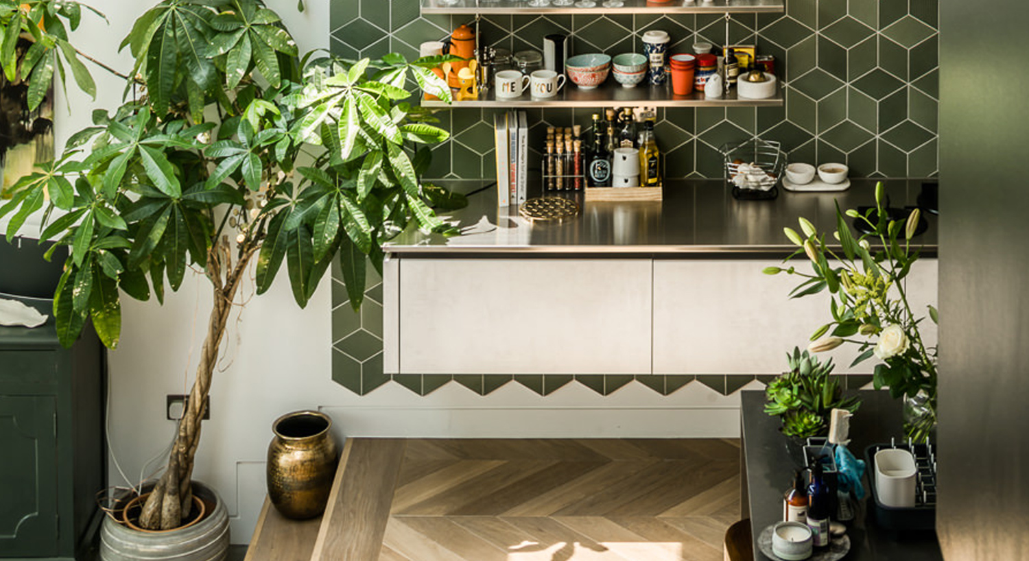 The new ground floor layout consists of a utility room, children’s play area, man cave, living room with original features and a large open-plan kitchen and dining area. The kitchen backsplash features Domus’ rhombus shaped Tex tiles in olive used in a cube layout. Designed by Raw Edges for Mutina, Tex is a colourful ceramic rhombus shaped tile collection inspired by fabric textures. The range consists of eight different colours in a natural matt finish. Each colour contains a set of three shades, re-creating the look of different tones of the yarn. The rhombus shapes can be arranged in three main pattern layout options which have an entirely different look.