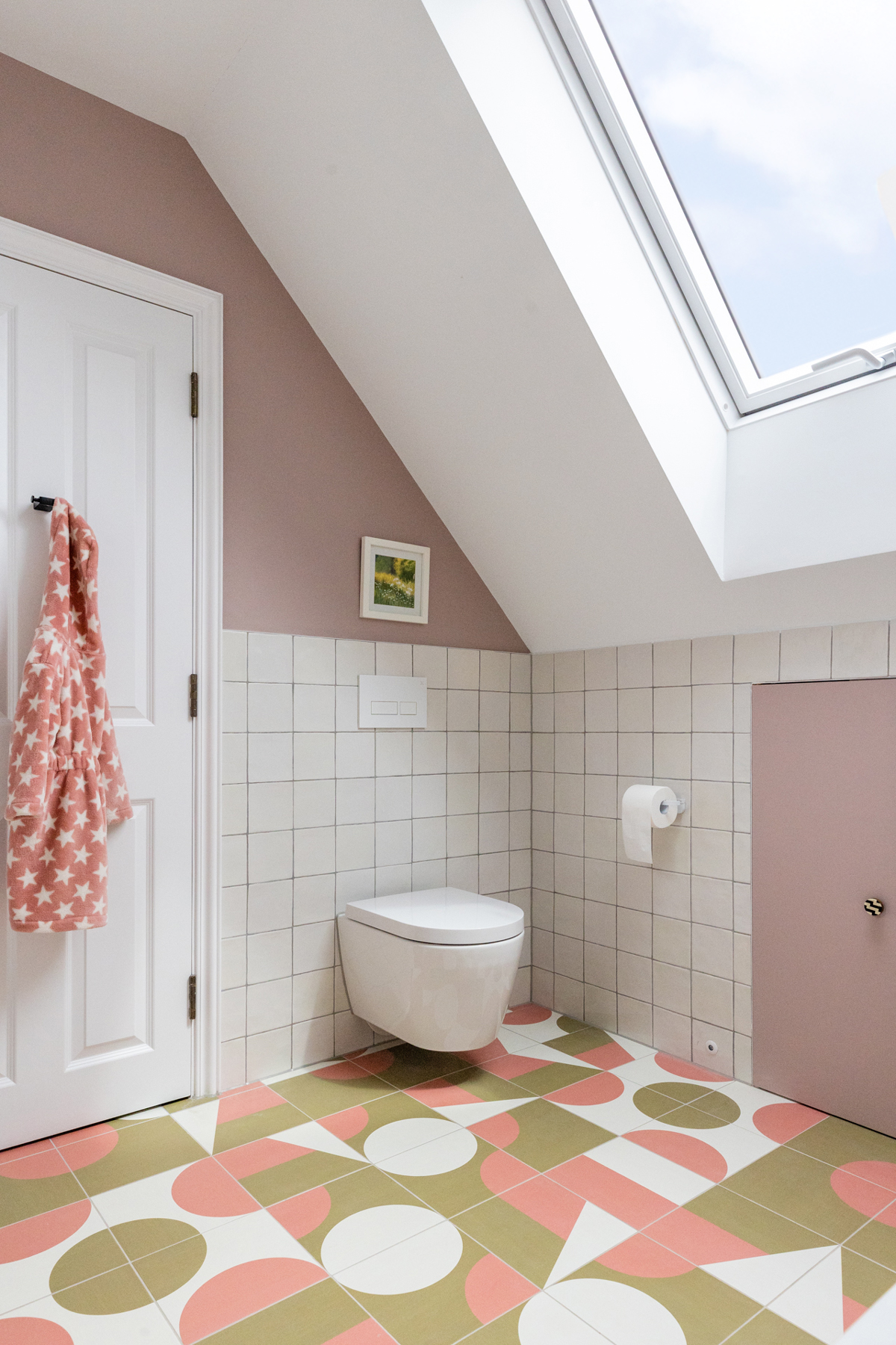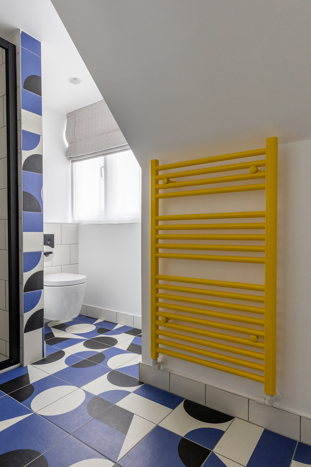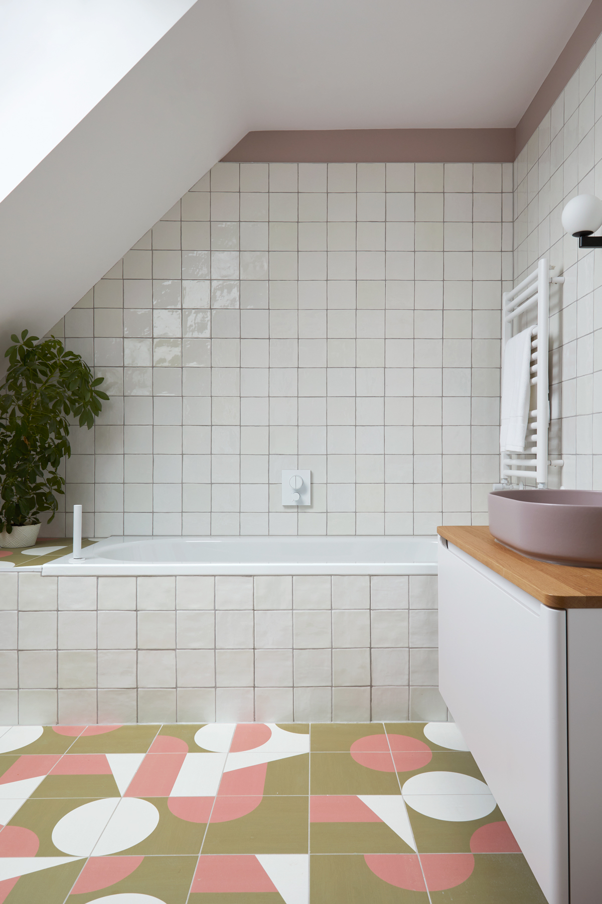 Though centred around the same product, each space has its own individual character. In one bathroom, the tile is applied across both floor and walls in a dynamic blue, with a bold yellow towel rail bringing a burst of energy. In the other, it features in soft pink and green hues, bringing a sense of calm to the space.