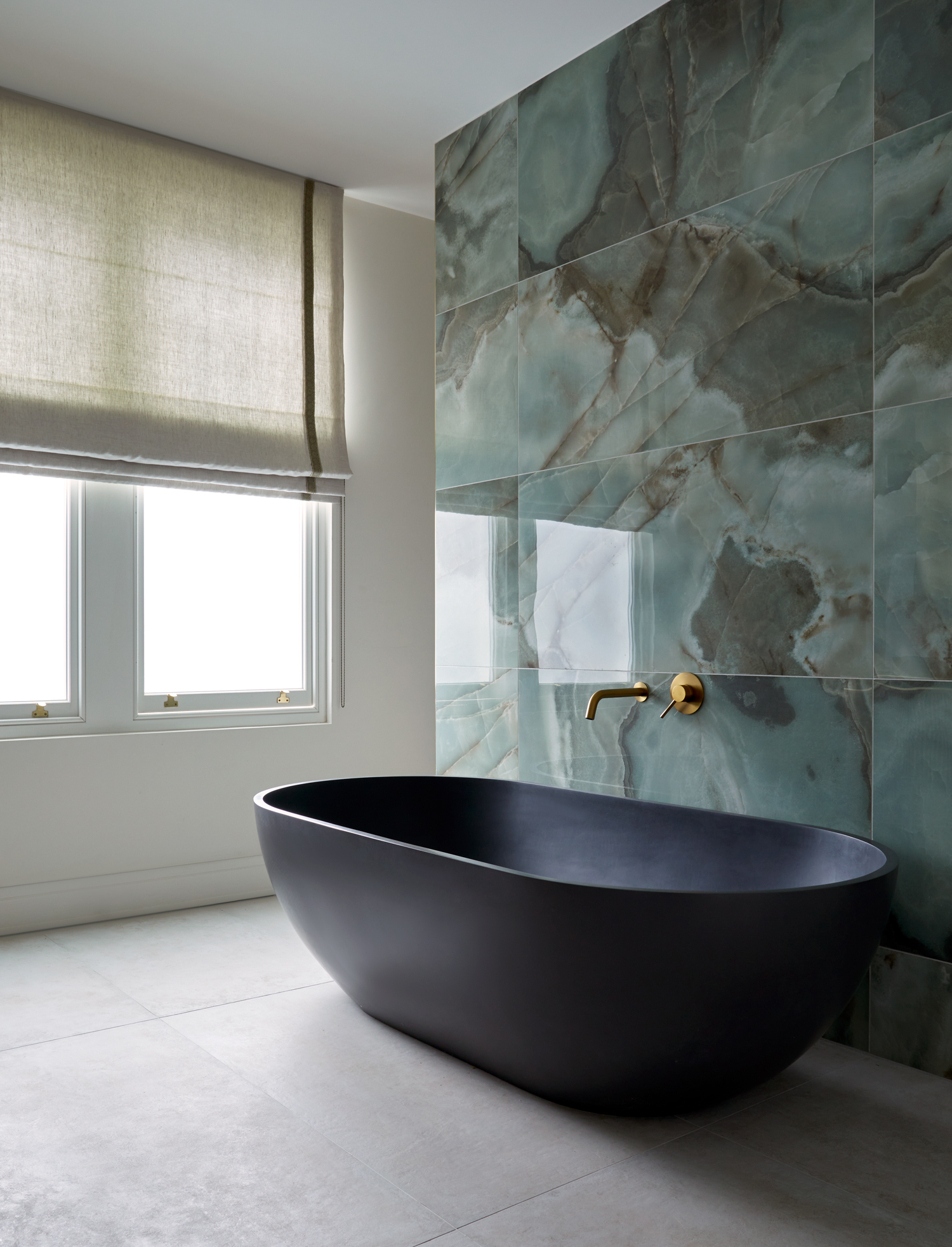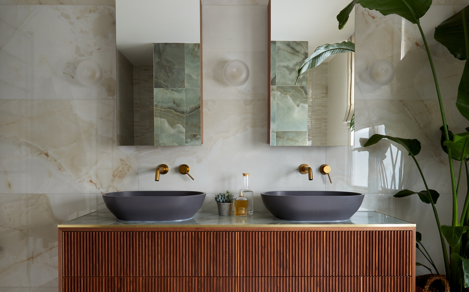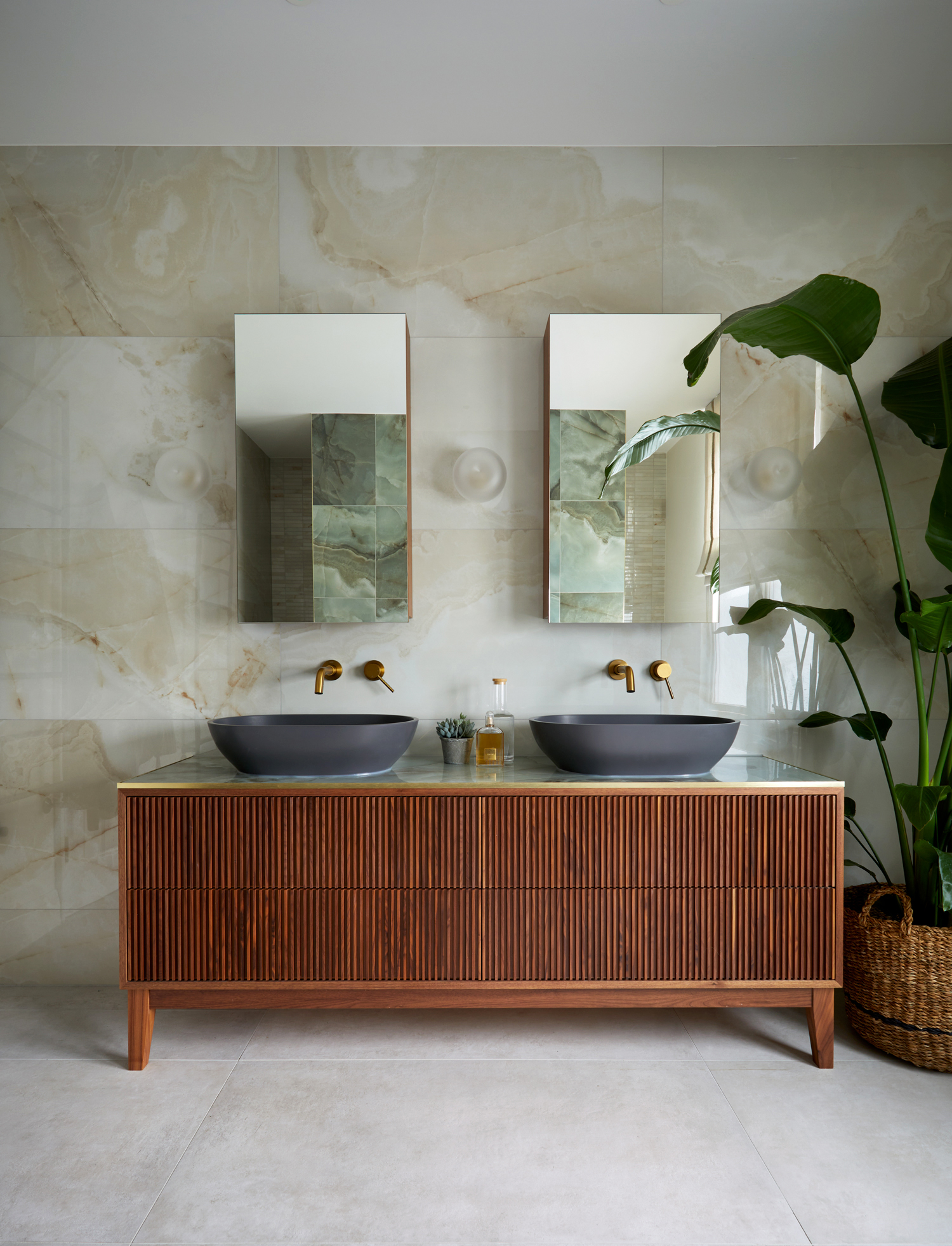 Designed as a tranquil retreat, the master bathroom combines soft greens and muted neutrals with rich timbers and brass accents. South-facing windows invite natural light into the space, drawing the eye to the feature walls clad with Domus Reves porcelain marble. On one side, Reves features in a light, neutral tone; on the other, a pale green.