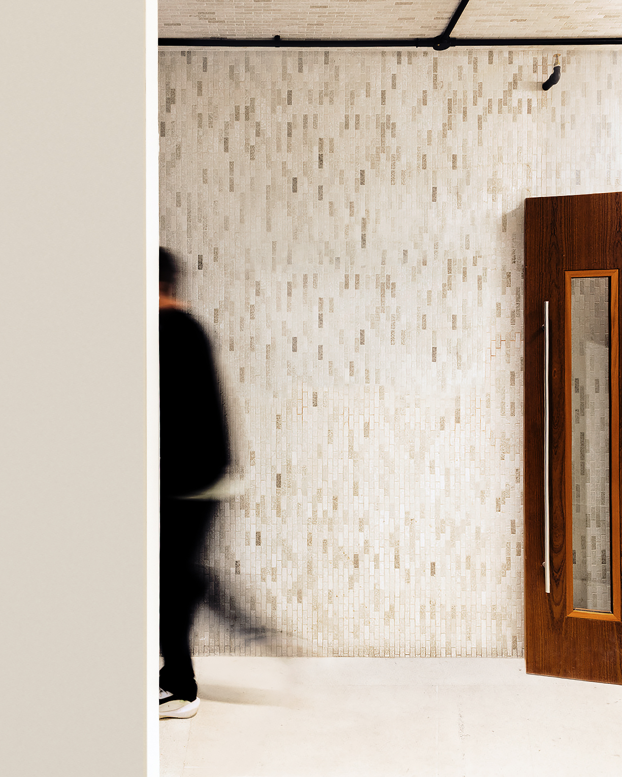 The vertically stacked mosaic panel was laid in a staggered bond, with each mosaic meticulously mitred to sit along the spine of the stairs. Achieving this level of refinement required careful coordination with renderers to ensure a perfectly flat substrate for immaculate installation.